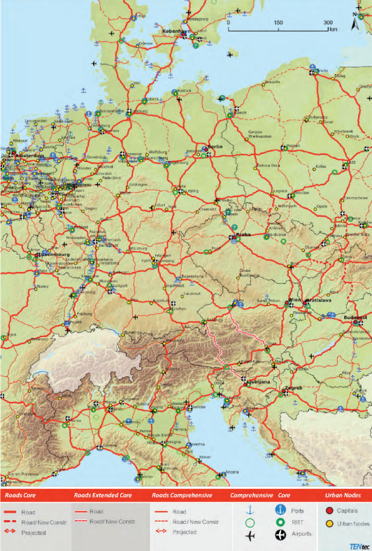 A map featuring EU plans for roads, ports, railroad terminals, and airports, with a whole nexus of paths cutting through and across Germany. Taken from the EU’s regulation to develop a European transport network (TEN-T, page 101).